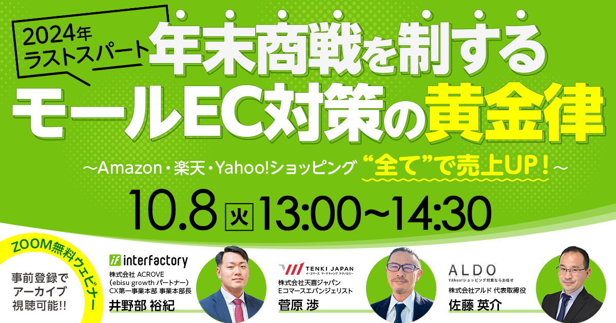 そこで本セミナーでは、主要モールECでの年末商戦を成功に導く「黄金律」をテーマとして、Amazon・楽天市場・Yahoo!ショッピングという3つのモールEC“すべて”で売上を上げる方法についてお話しします。